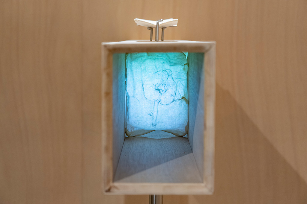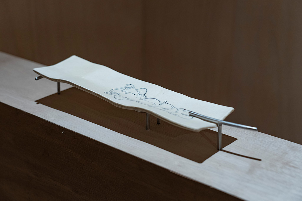 道具は身体の延長として機能の拡張を担う一方で、本来の身体機能を退化させる側面も持つ。人間が道具を変容させれば、身体もまた道具に沿うように変容する。この相互作用の中で両者の境界は流動し、あたかも元から一体であったかのように曖昧になっていく。私はこれらの境界を探るように、変容の先にある「自らが道具と化した人間像」を描く。身体を変形させ限界を確かめるその姿は、一度アニメーションとして描き出される。連続する時間の断片であるドローイングは、すべて糊で固められ、剥がすことのできない地層となる。それは「動かない運動体」として肉の塊のように存在し、投影される映像は物質の表面をなぞる「反射光」として目に届く。停止した人間の記録が、現在の空間へと静かに現出している。