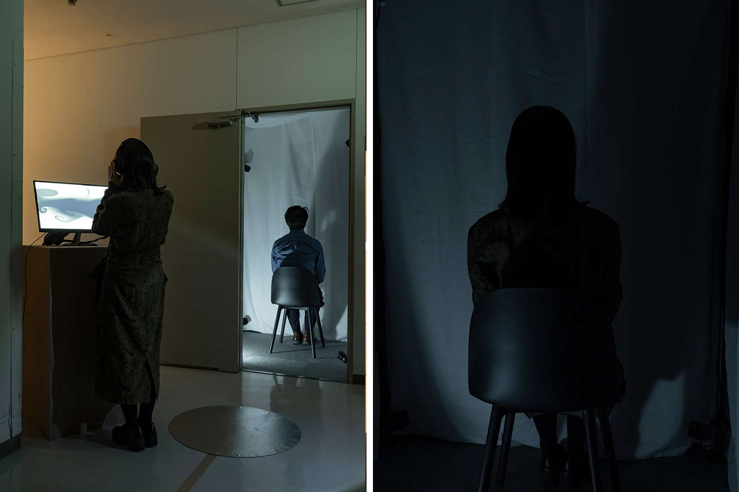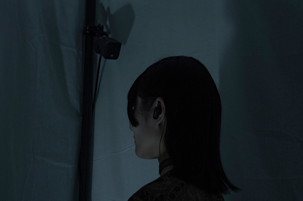 本展示は、音を意識的に聴く一歩手前の「聞こえ」そのものを設計対象とする「Hearing Composition」の2つの実践である。《8.-2ch Cube: NaN》は、8つのスピーカーとノイズキャンセリングを組み合わせた作品である。左右が独立制御されることで生じる酩酊感や、耳という扉が開閉されるような感覚は、音響的な記述を超えた独特の質感を提示し、音表現の新たな領域を切り拓こうとする。《Display for Hearing Motion》は、ディスプレイとヘッドホンによって構成される作品である。環境と身体の間に立ち上がる現象としての「聞こえ」を再構成する試みである。「立体音響」と「視覚情報との連動」の2つの切り口から、未定義の聴覚体験への到達を試みる。