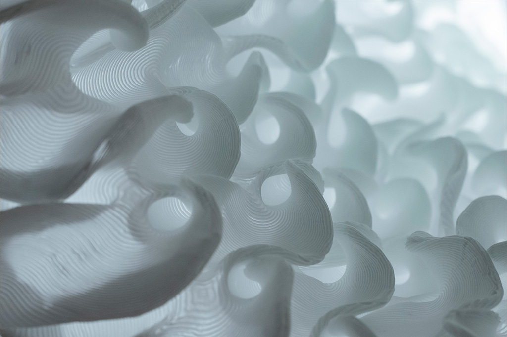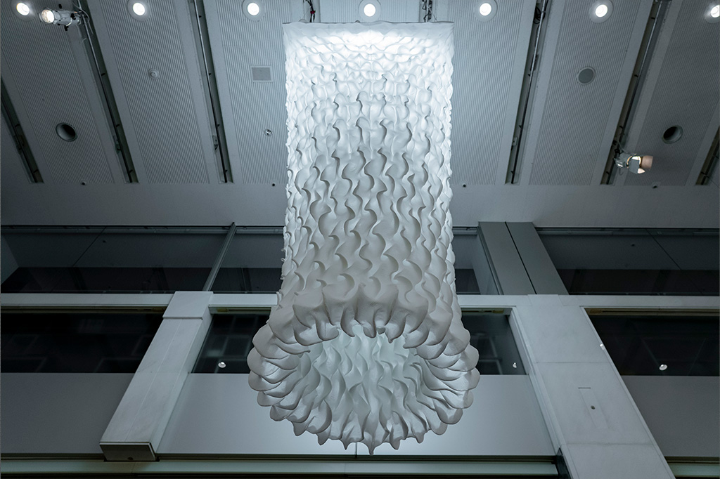 織姫に手芸や機織りの上達を願って飾られた七夕飾り「吹き流し」をモチーフに、筒を成すジャカード織の生地が天井から吊り下げられている。布の縁をくぐって中へと立ち入る時の、一旦下を向いてから上へと向かう視線の運動は、空の向こうへ思いを馳せ、願いを込める人間の眼差しをなぞっている。七夕伝説に限らず、星、山、木など、上方を指し示すものが象徴的役割を果たす例は洋の東西を問わず無数にあり、上を仰ぎ見るという行為は、重力に逆らって立つ人間の想像力を、根本的に掻き立てる。見上げた先にある織物の立体的なひだには、光が複雑な陰影を生じ、自然物や装飾などの連想を引き出す呼び水となる。本作は重力に従って吊り下げられた布を起点に、想像力との関係において、仰ぎ見るという行為を再構築している。