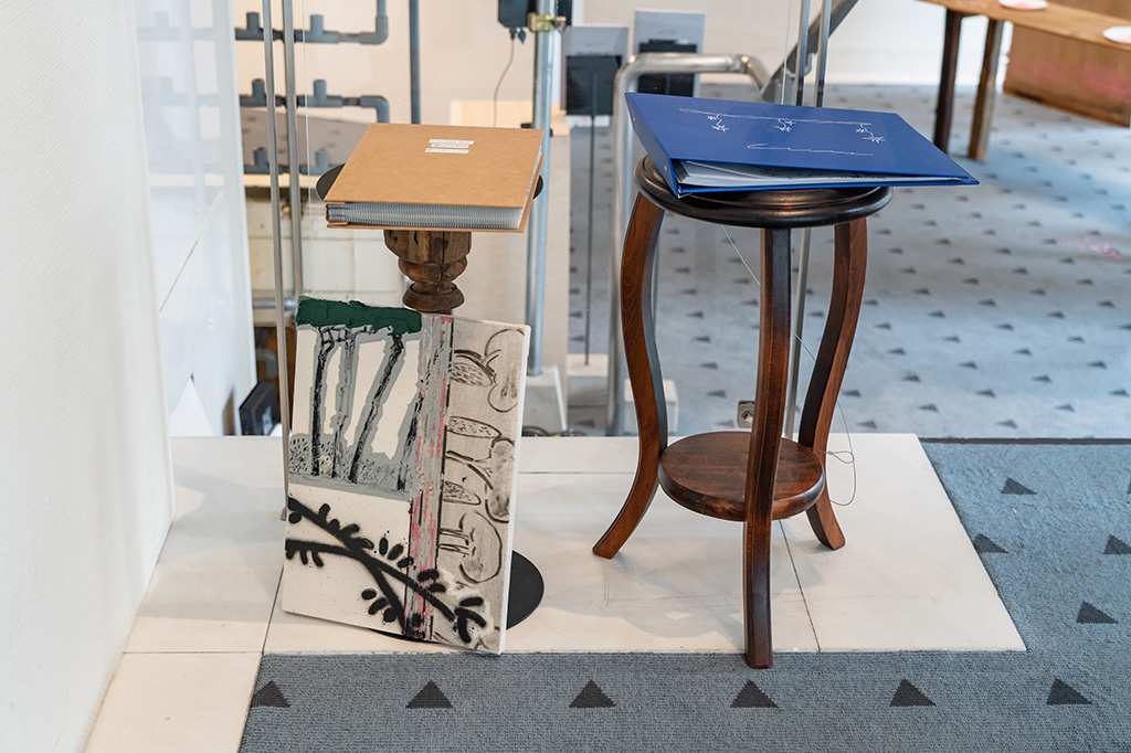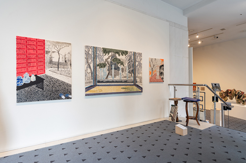 本作は、イタリアで接してきた風景と、日本をはじめとするアジアの日常風景がもとになっている。移住や留学で住む場所が目まぐるしく変わる中で遭遇する日常の風景が、身近でありながら、どこか不確かで掴みきれないものに思えてきた。出発点はマンガの背景画への関心だった。キャラの背後に広がる、静かで空白の多い空間は、省略や編集を通して生まれてくるが、そこには、写真的な再現とは異なるリアリティがある。現実の風景にはそれがない(あるいはそう感じにくい)。他方、理解ではうまく回収されず、視線を滞留させるのがマンガならではの風景性ではないかと考えた。本作は、日常風景を再現する試みではない。「風景を重ね、折りたたむ」というタイトル通り、すでに住んでしまった風景をもう一度背景に戻すアクションである。