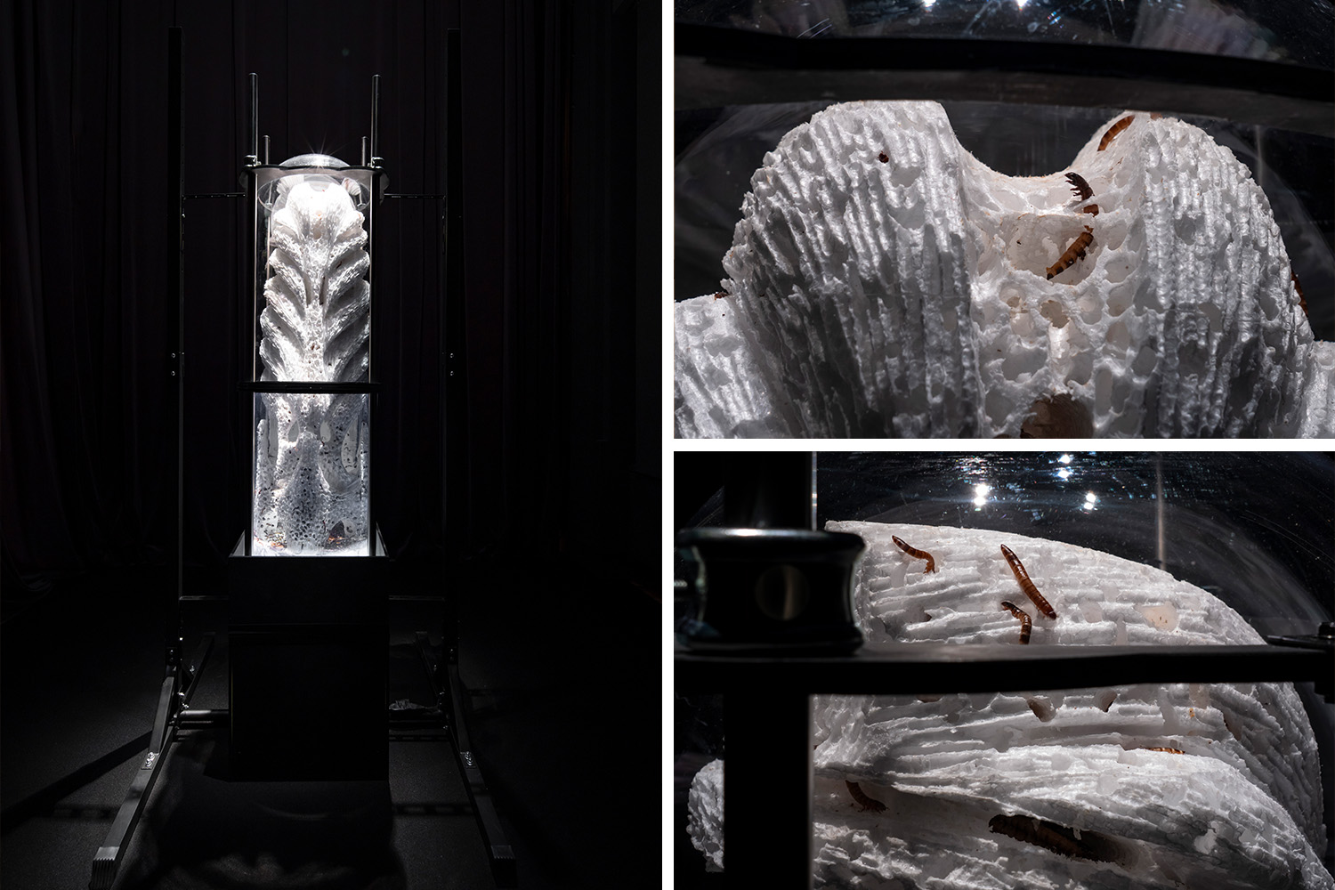 ゴミムシダマシの幼虫、ミルワームにはプラスチックを食べ、生分解する能力がある。本プロジェクトは、この虫との共同制作を通じ、西洋中心的な自然観が意図的に切り離してきた、人工文明と自然との境界を問い直す試みだ。プラスチックの原料である石油は、元を辿れば太古の生物が堆積した「命の凝縮」だ。人間が消費し廃棄してきた物質を、ミルワームが再び自然の代謝系へと接続していく。カプセル内に残された無数の食痕は、断絶していた文明と自然が再接続された痕跡である。「Plastisphere」を単なる環境汚染の象徴としてではなく、人工と自然が混ざり合い、新たな循環が編み出される静かな再生の場として提示する。