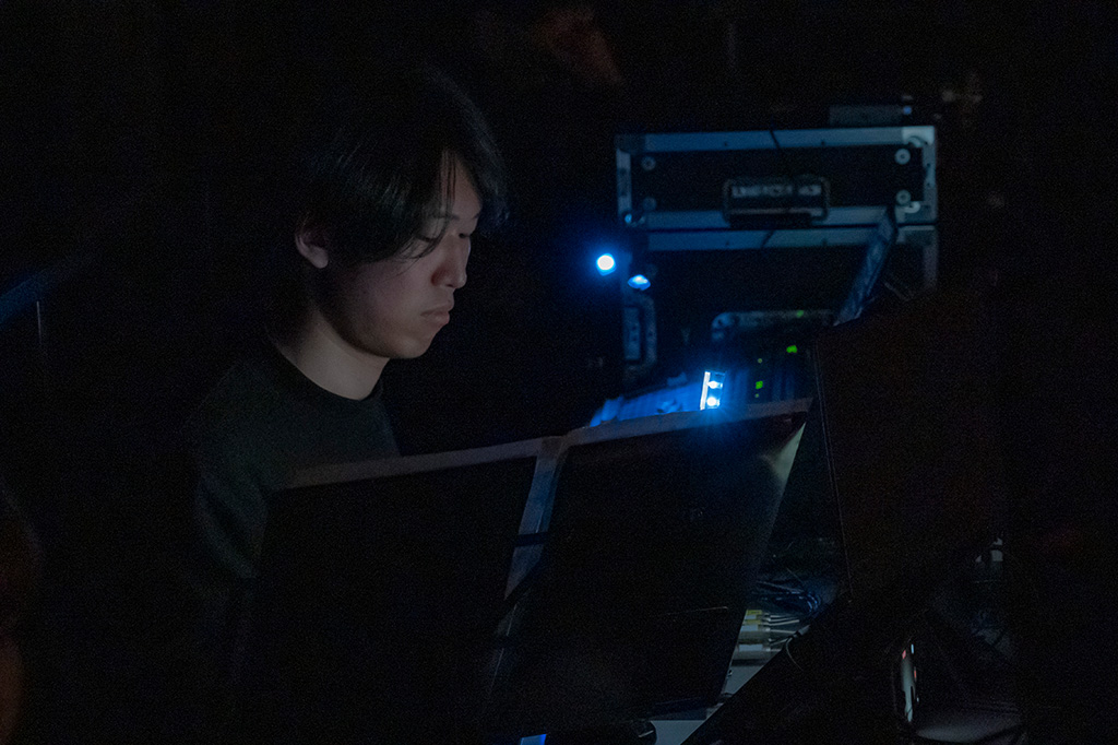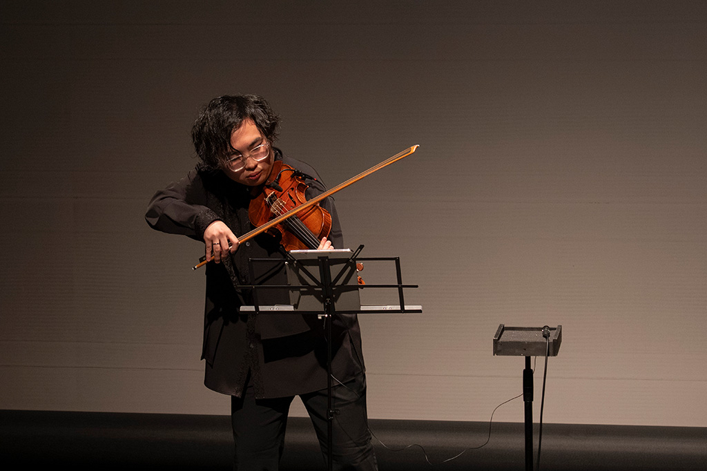 本作「Particles(粒子)」は、粒子が形を変えながら空気中を舞う様子を描いた音楽作品である。正面に立つ奏者から生み出されるヴァイオリンの音を、電子エフェクトを介してリアルタイムに変容・拡張させ、見えない粒子の運動を立体的に感じられるように構築した。スピーカーを複数箇所に配置することにより、音の拡散や移動を空間的に演出し、見えない動きを聴覚によって体験できる構造を目指した。