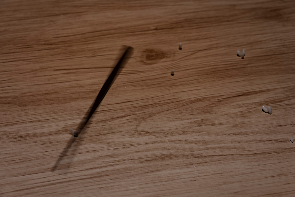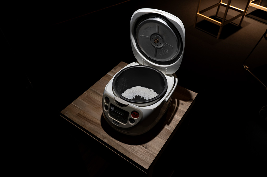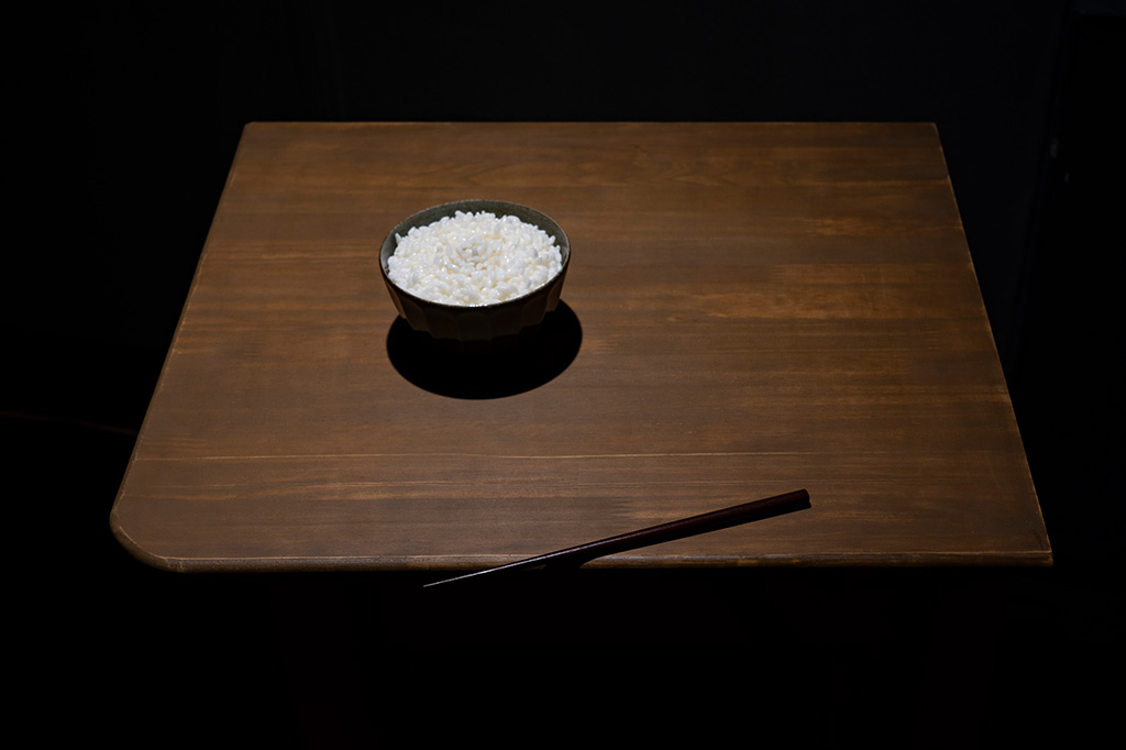 本作品は、他の米粒の流れに逆らって走る「炊飯器の中にいる米」、茶碗の中でもぞもぞと動き、立ち、倒れる「茶碗に盛られた米」、床の上で箸を蹴りあう米と、それを見つめている米粒による「床に落ちている米」の3つの装置で構成されています。米粒は、社会をサバイブするためにもがくように動きます。私はこれまで様々なものを動かしてきましたが、今回は「今までで一番小さいものを動かす」ことに挑戦し、エンジニアリングによって制御された動きと、もの同士の接触時の反動によって生じる自然現象による動きを組み合わせ、ものに意思が宿っているような動きを制作しました。長い学生生活も終わりを迎え、これから何を信じて生きていくかという悩みが、日本人にとって信頼されてきた存在である米粒の動きに反映されています。