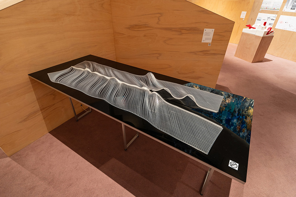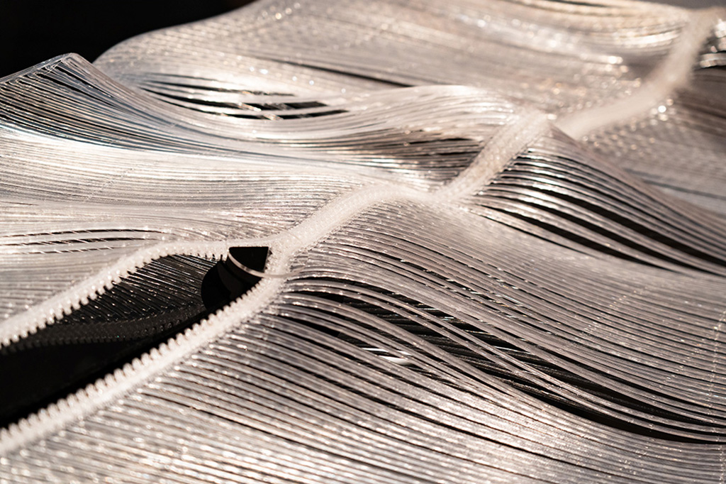 1891年、米国の発明家Whitcomb L. Judsonが現代のジッパーの原型になる「Clasp-Locker」の特許を出願した。靴紐を代替する素早い開閉機構としての提案であったが、Judsonは「やわらかいもの同士の継ぎ目であればどこでも」適用可能であるとしてその発明の可能性を野心的にアピールした―。ものづくりの技術が発達した現代、私は3Dプリントによってジッパーの再発明を試みる。本作品は、計算された形状の歯を閉じていくことで布を立ち上げ、材料の硬さや重力などそこにある物理と協調して予期せぬ形態を生み出す装置である。
