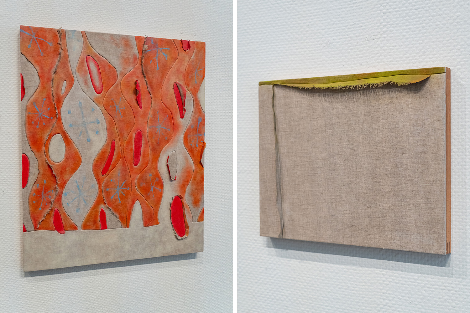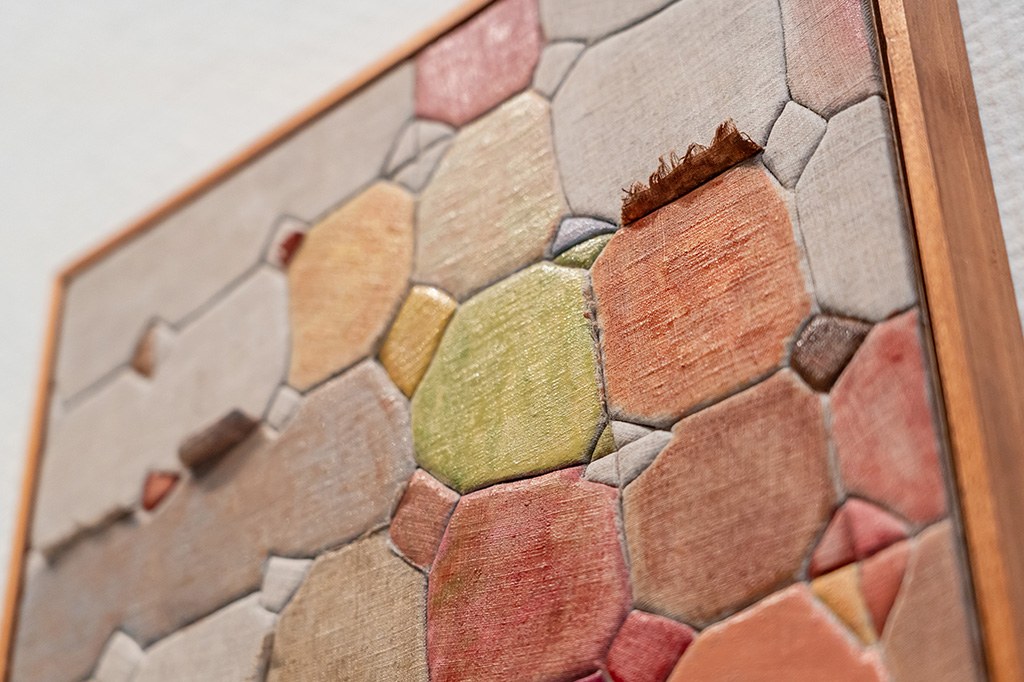 子供のころ、世界を触れるようにこちらから見ていた。やがて他者の視線を意識し、「見られる自分」として立つ時間が増えていく。装うことは、その関係のなかで立ち位置をわずかに調整するための、ささやかな手がかりだ。布を支持体に差し込むことで、内と外、表と奥は重なり合い、視線はひとつの場所に留まらず、静かに行き来を繰り返す。その間のなかに身をゆだねてみる。