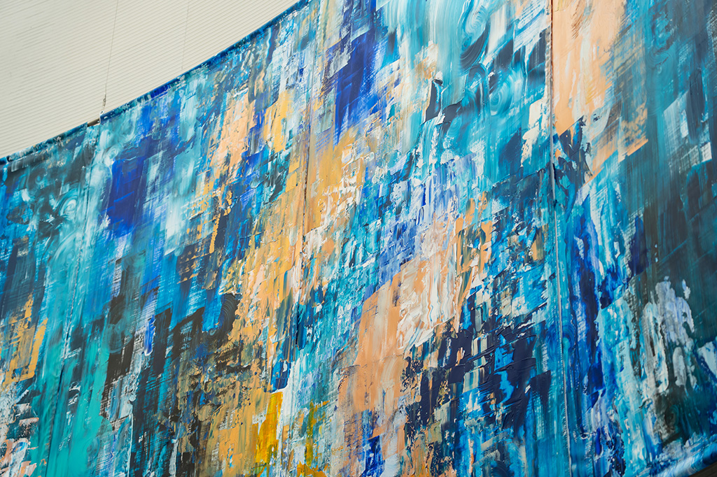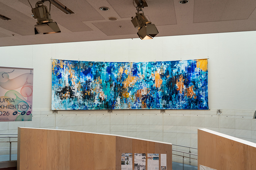 本作は、私たちの身体を知らず知らずのうちに包む時間や重力の感覚を、縦方向に反復する筆のストロークに託し、「新しい風景」として立ち上げた抽象絵画です。制作にあたり、円弧を描く壁面に沿うかたちで、幅10メートルのキャンバスを設えました。緩やかに連続しながら、これから進むべき方向を静かに指し示すような風景を、壁面の形状そのものに呼応させて描いています。また本作は、ポール・ゴーギャンの《我々はどこから来たのか、我々は何者か、我々はどこへ行くのか》に触発され、その根源的な問いを現代の絵画として再解釈する試みでもあります。これまで積み重ねてきた経験と、これから訪れる時間の両方を見据えながら、現在という一点にしか描けない絵画を通して、「自分とは何者か」という問いに向き合いました。