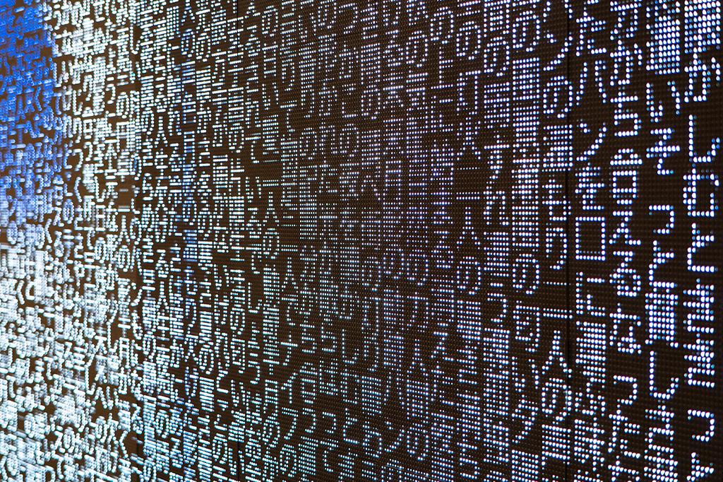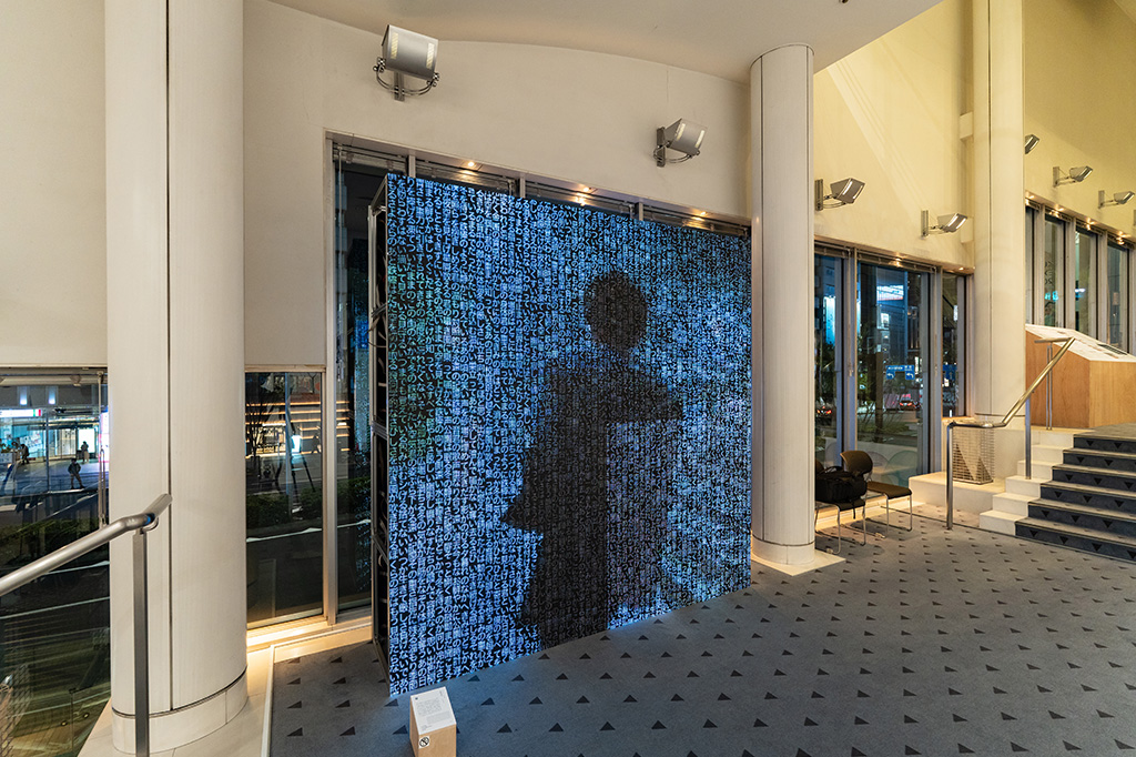 都市の日常風景に溶け込む電光掲示板というメディアを用いたインスタレーション作品。W2.5m×H2.5mの大型サイネージを両面に設置し、片側は展示空間、もう片側は窓越しに街へ向けて文字を表示する。遠くから見ると巨大な街の電光看板のように見えるが、近づくとそれらは複数の小さなストーリーや詩的なテクストの集合体で構成されている。遠景と近景によって意味が変化する構造を通して、単純で曖昧な一文字として現れる外面と、詩として編まれた内面という関係を表現した。街の電光掲示板に擬態することで、都市の中に潜む言葉や詩に偶然出会う体験を生み出すことを試みている。タイトル〈IN-OUT〉は、内と外、展示空間と街、外面と内面といった境界のあいだに作品が位置することを示している。