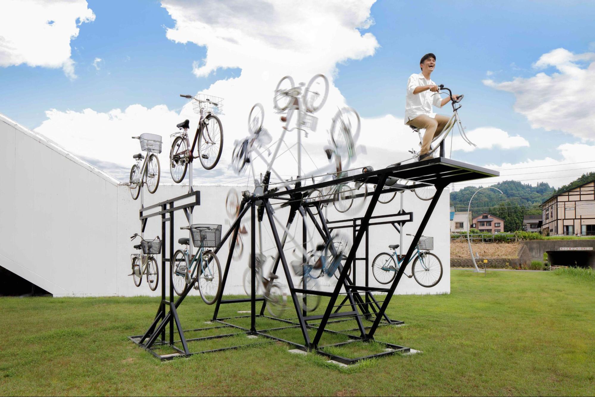 大地の芸術祭で発表された巨大重機アート〈人間エンジン〉を生み出した東弘一郎は、地域との対話を軸に作品を生み出す。彼にとってパブリックアートとは置物ではなく、記憶や交流を生む「生きた彫刻」であるべきという信念のもとに。地域の声を取り入れ、不要とされれば撤去もいとわない。自転車を原動力に、人々が力を合わせ動かす作品は、身体性と協働の喜びを引き出す第三の鑑賞法にもなる。そう語る東のアーティストとしての態度、パブリックアートへの考え、今後の展開について話を聞いた。