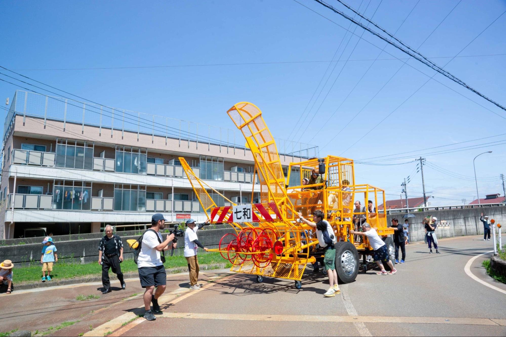 で、でかい作品の魅力というのは見上げるですとか、圧倒される点にあるわけですけれども、〈人間エンジン〉においてはこのデカさによって街を守っているんですよね。豪雪地帯に暮らす人々にとって、死活問題である道路の降雪問題を素早くパワーで解消してくれる地域のヒーロー的な側面がある。この何十トンもある、通常はエンジンで動かすものを人力で動かすとなれば、一人で動かせないことは間違いない。そうは言っても、何人掛かりになるのかの想像もつかない。そうなると地域の人たちを「俺も力を貸さなきゃ作品が動かないぞ」って思わせる理由になるし、力を合わせていざ作品が前進した時の達成感も極まる。大きさのパワーが、ひとりひとりに働きかけたし、なにかを掻き立てたってことはあるんじゃないでしょうか。これが半分のサイズだったら、果たしてみなさん協力してくれたのかなと、たまに想像することもあります(笑)。