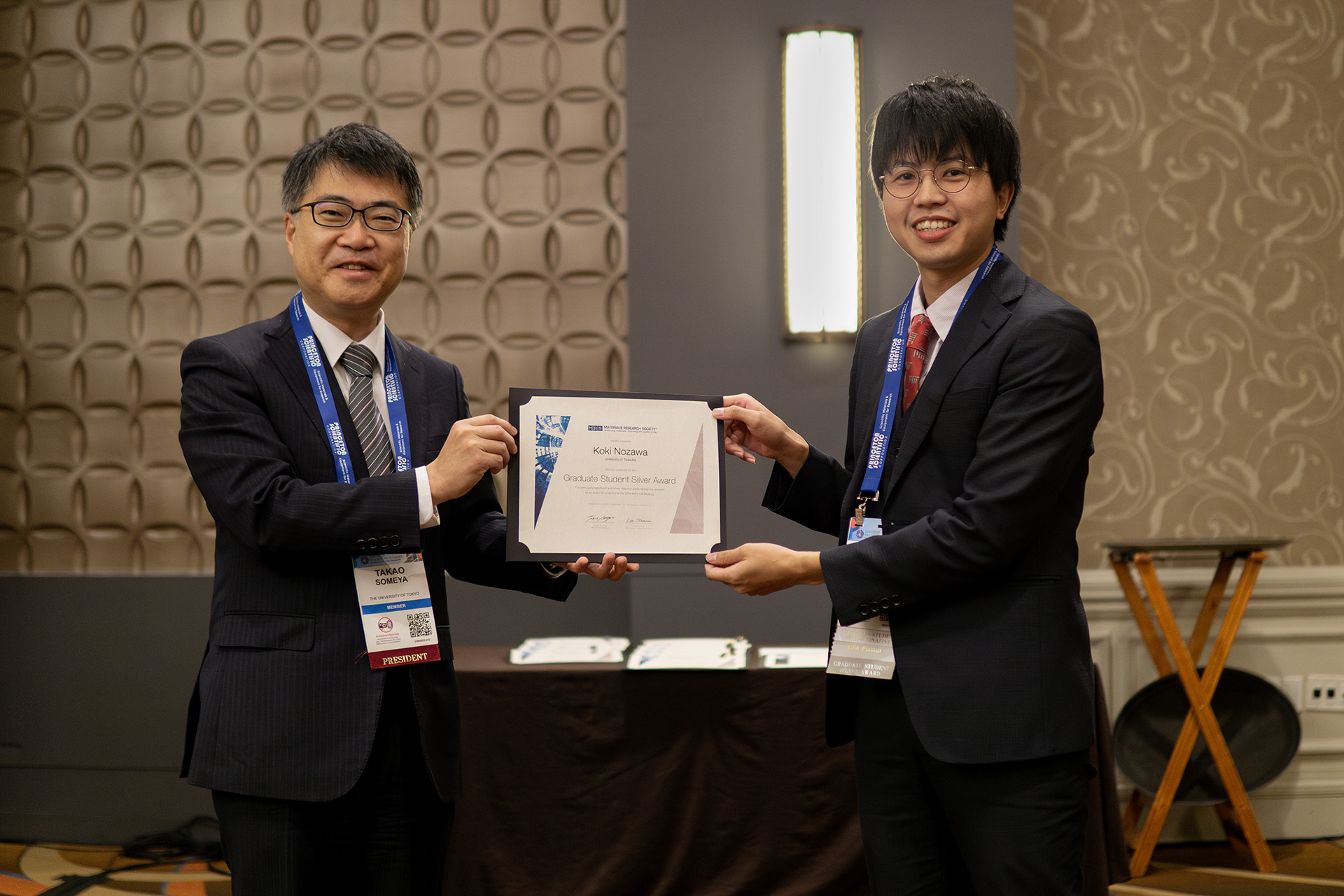 MRS Graduate Student Award受賞式で、当時のMRS会長・染谷隆夫教授と。