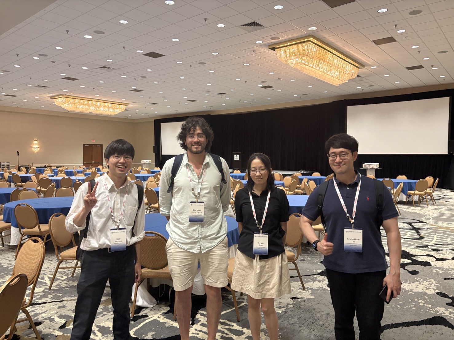 アメリカノースカロライナ州で開催された「Electronic Materials Conference2025」のDinner party後の写真。韓国、台湾、メキシコにルーツを持つ学生と仲良くなり最後に写真を撮った。
