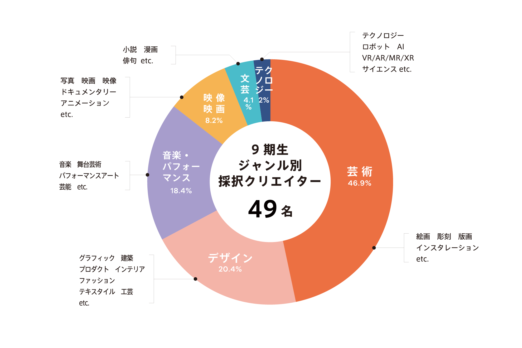 美術・現代アート・テクノロジー・音楽・建築など、29種に及ぶ様々な領域の若手クリエイターを支援してまいりました。これまで第1期生〜9期生の総勢433名を支援しています。