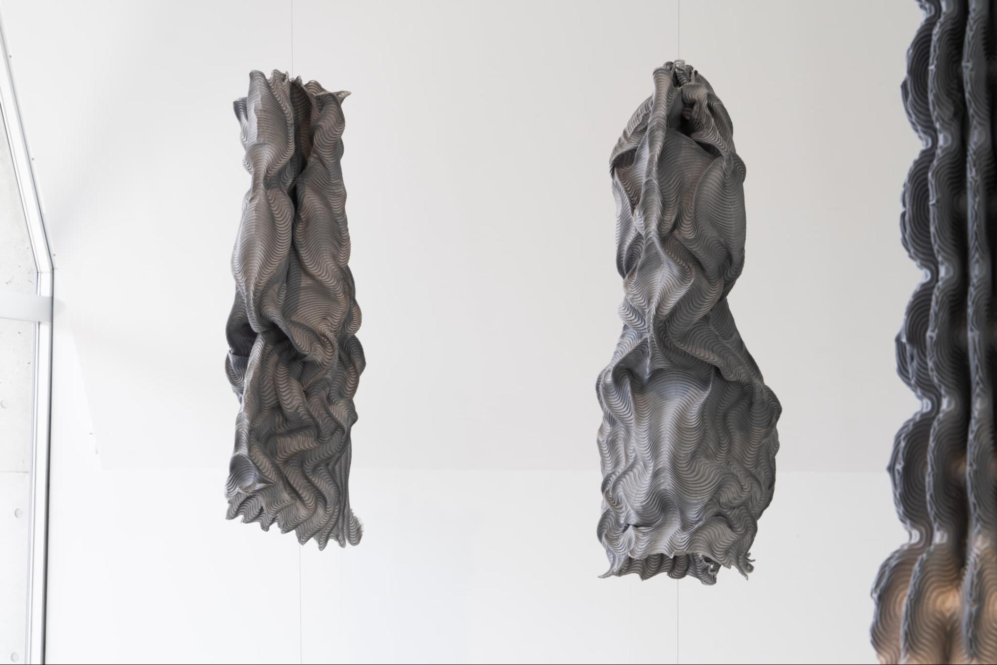 上條:意図して設計していることと、実際の出来にズレが生じることは往々にしてあるんですが、その意図せぬ表情が却って面白く、今後積極的に取り入れていきたいところですね。ひだをきれいに寄せるつもりだったところが、バランスが崩れるですとか、特定の折線は機械がうまく折れずにくしゃくしゃになってしまうですとか。いずれもうまく作品には落とし込めていませんが、そういう事象が起きるか否かは素材によって支配される要素ですので、どの素材を選ぶからどういう構造・表現が生まれるかは切り離せないと実感します。