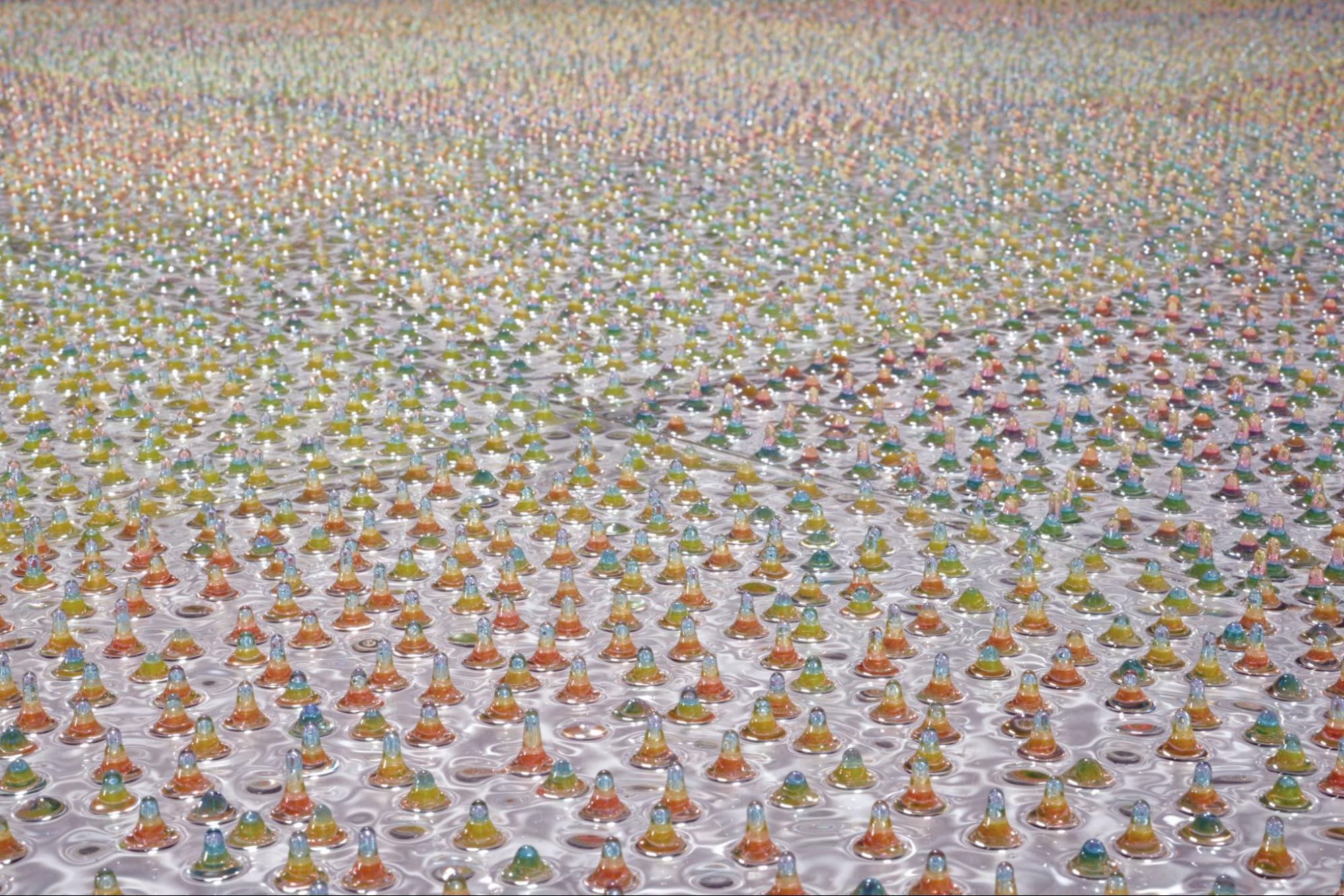 風呂場の天井に水滴が付着する様子に着想を得た作品。繰り返しアクリル板に樹脂を塗り裏返す過程から、水滴の成長過程を具現化した。また、樹脂の着色を変化させることで、水滴の成長過程を層構造として可視した。