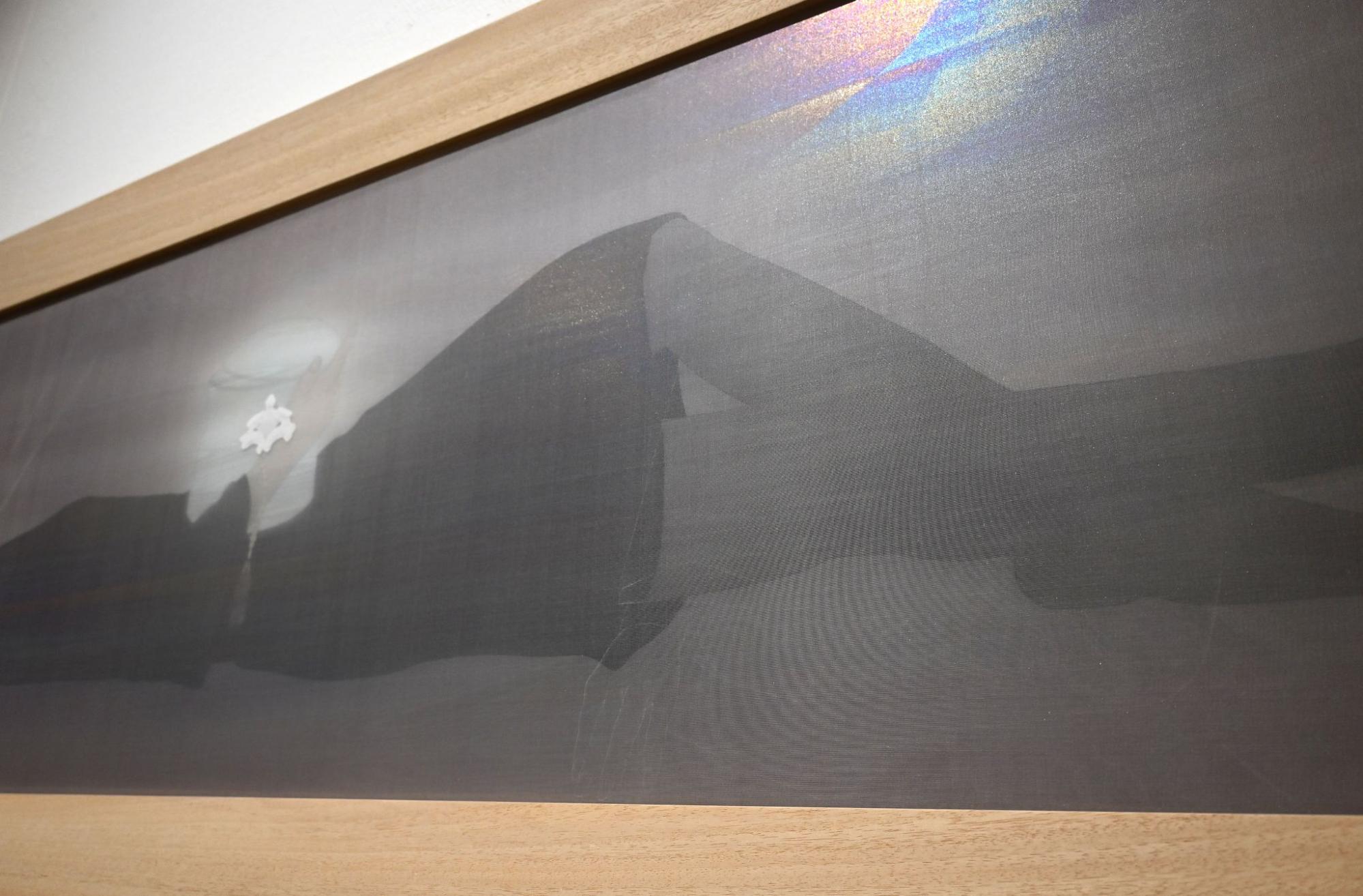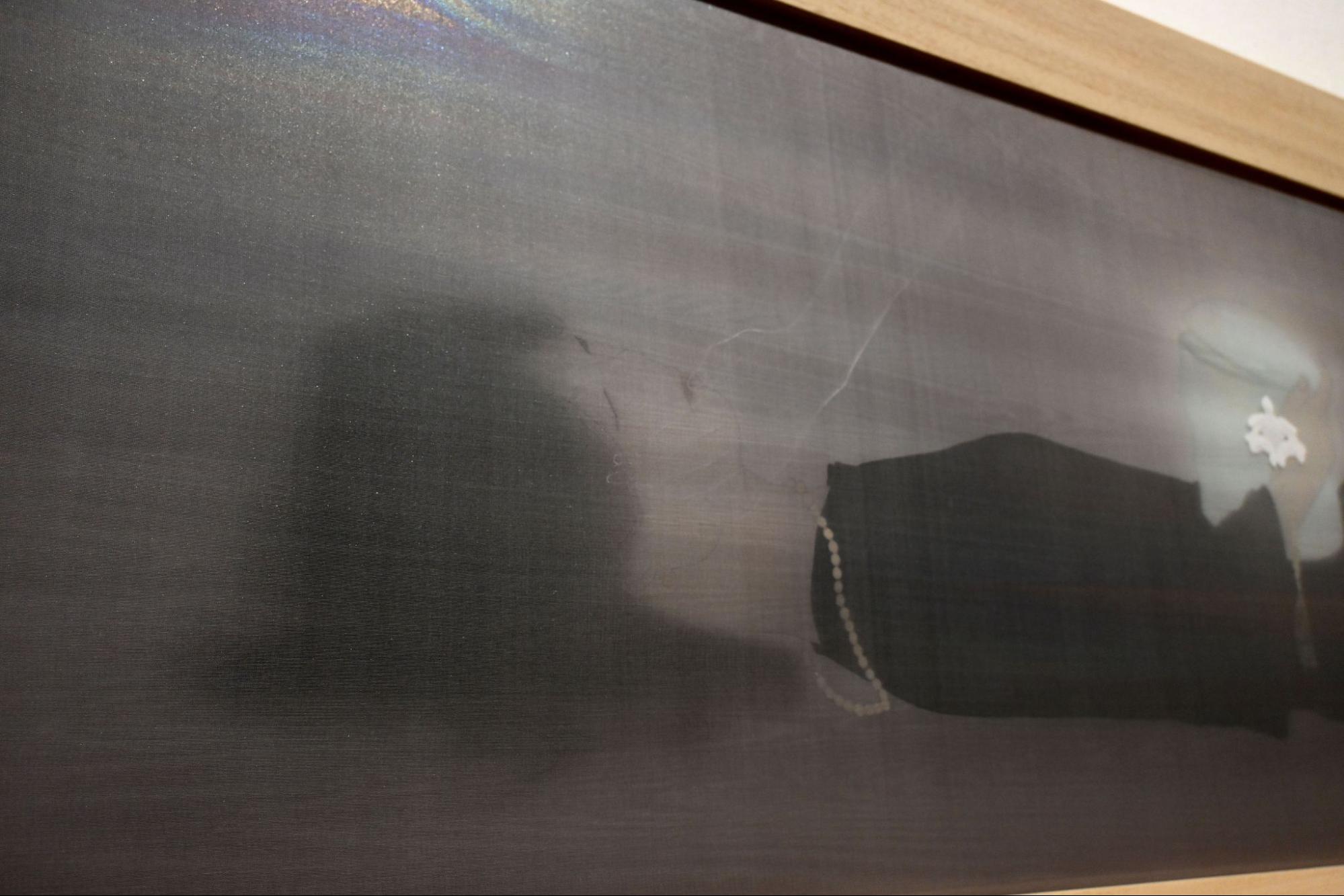 全面に貼られた裂布に、角度によって光沢が変化する素材を用いることで、見えるもの/見えないもの」のあわいを視覚的に表現した。素材そのものの物質性と視覚効果を取り込むことで、幽霊という存在の不確かさを空間全体で提示している。