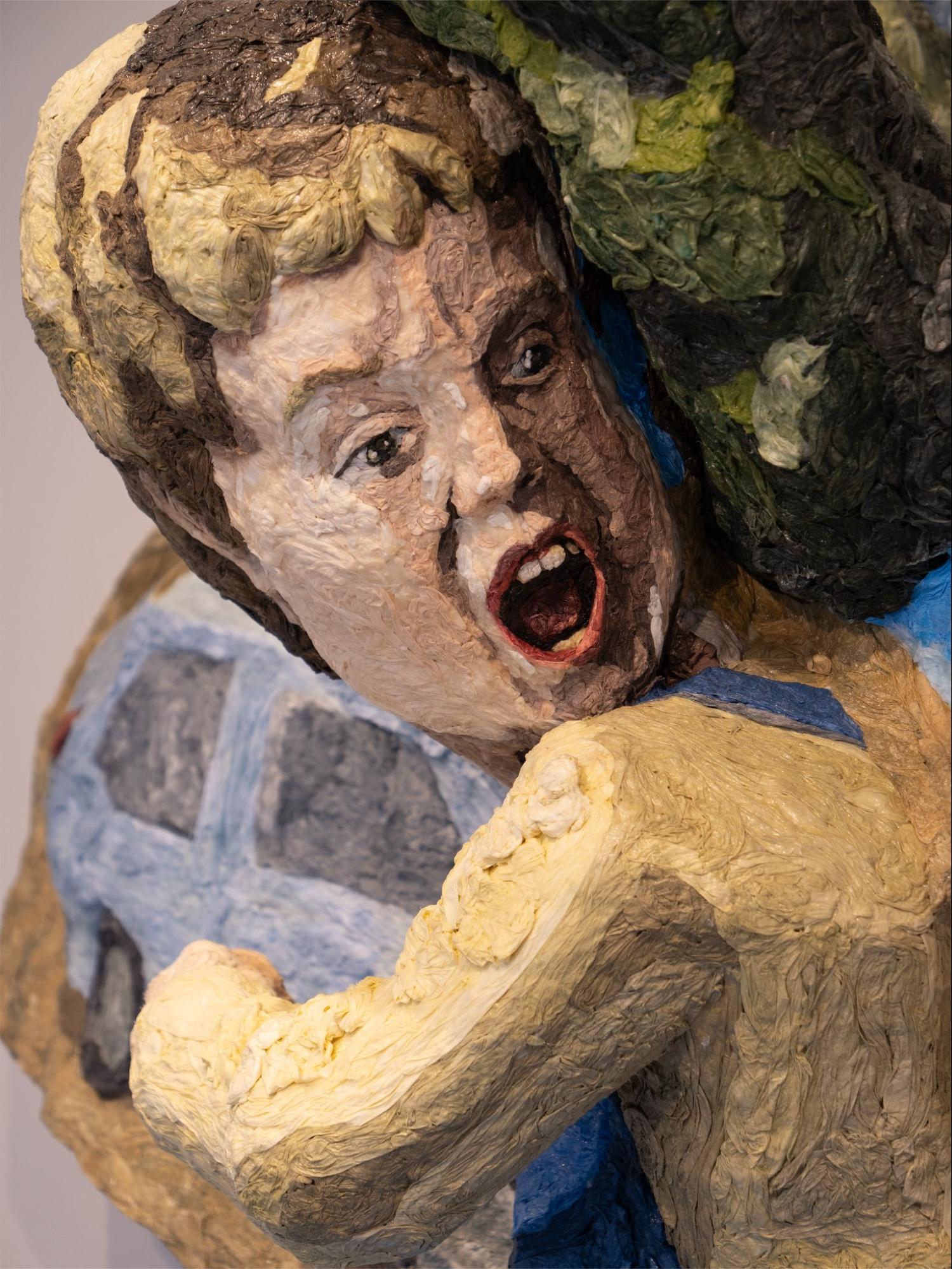 本岡:僕はなるべく、彫刻作品を「造形物」そのものとして見せたい願望を強くもっています。それは作品に込められた物語あるいはモチーフが前面に出てしまったり、「物語のための彫刻」になったりする弊害を本質的に宿す彫刻特有の弱点ともとれますが、いずれにせよ、作品の造形そのものが捉えにくくなり、かつ「議論して欲しい」部分へのフォーカスがぶれるように思うからです。さらに言えば、造形物として見せる———文脈を固定しないことで鑑賞者が自由に解釈できる余地を生むと考えています。先ほどの作品「鬼ごっこをする子供の風景」を引き合いに出すと、ある人にとっては鬼ごっこに見えるかもしれませんが、別の方にとっては、巨人の子供が街を破壊しているように見えるかもしれません。どのように解釈するかを全て鑑賞者に委ねたいですし、それは僕の関与する領域ではないでしょう。僕の彫刻は、「絵画と彫刻の間という主題」をより強く考えるための「作品」であって欲しいんです。