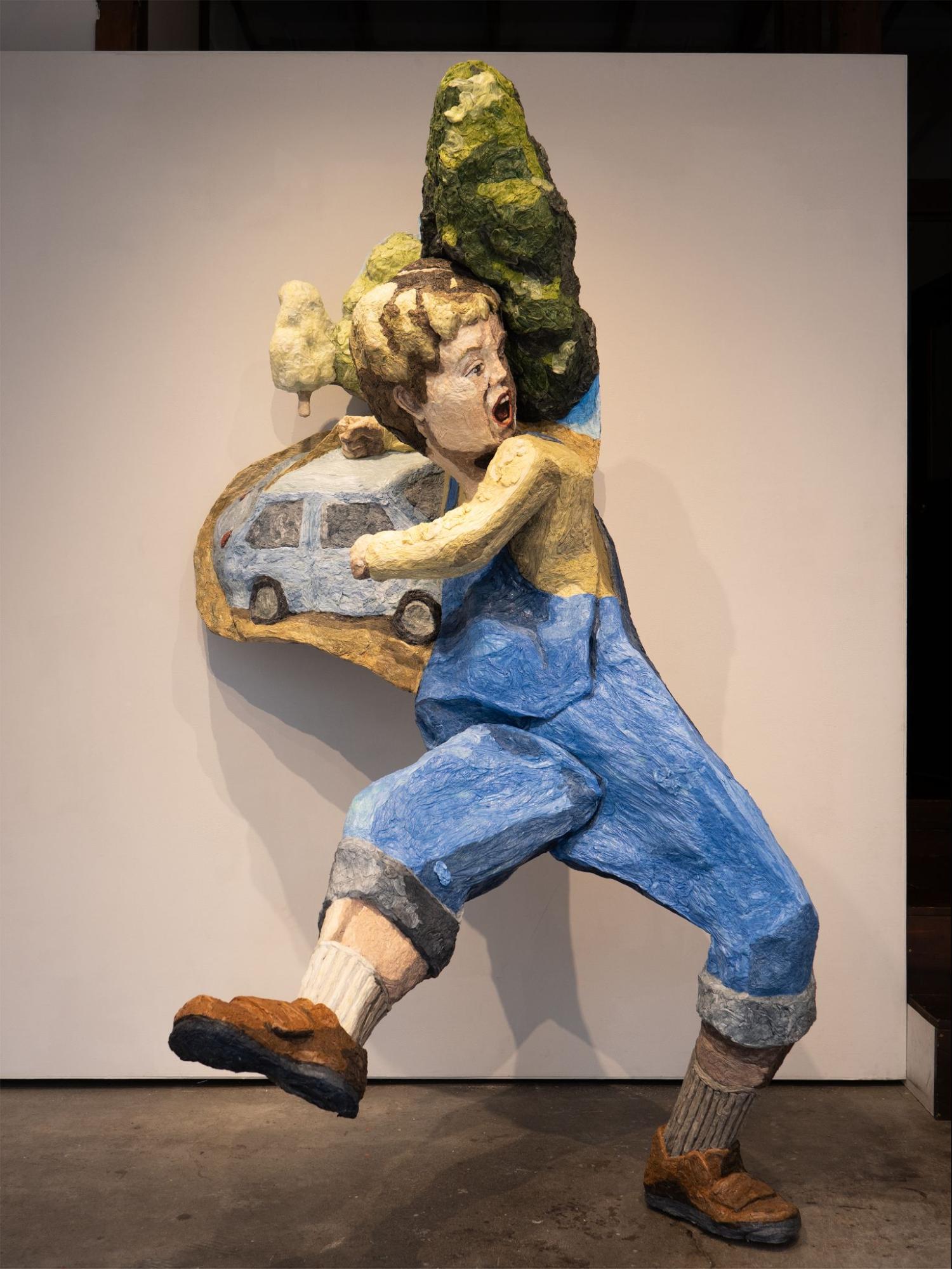 一方で、それでもモチーフを使うケースは確かにありまして、例えばモチーフなしでは関係性が見えてこない場合もあります。モチーフの位置———奥に木、その前に車、いちばん手前に人が位置する———による奥行きの体感は、絵画的な関係性なくして成立しません。そういうわけで、やむを得ずにモチーフを採用しているというのが正直なところです。ただしそのおかげで、彫刻としての物質的な見え方と、絵画としての空間的な見え方が互いに相反関係を生み出し、矛盾した状態が生まれるので、結果的に豊かな造形を生み出す産物にもなっています。