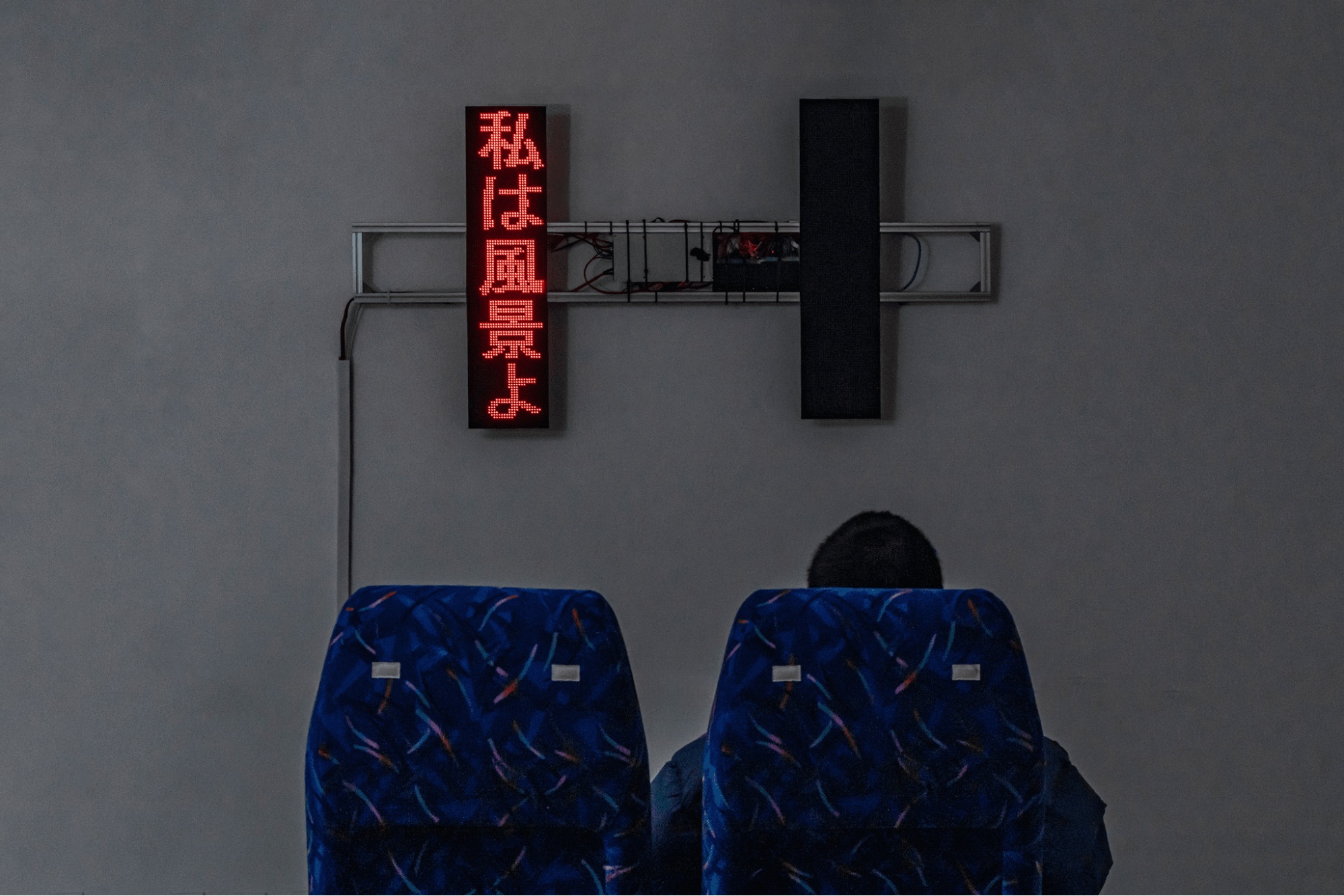 橋本:この作品は視覚で言葉だけを追い続けるだけではなくて、新幹線の座席を模した椅子の接面———お尻と触れている面からも体験が始まっていて、臨場感が相乗効果として出ていく感じもありますよね。