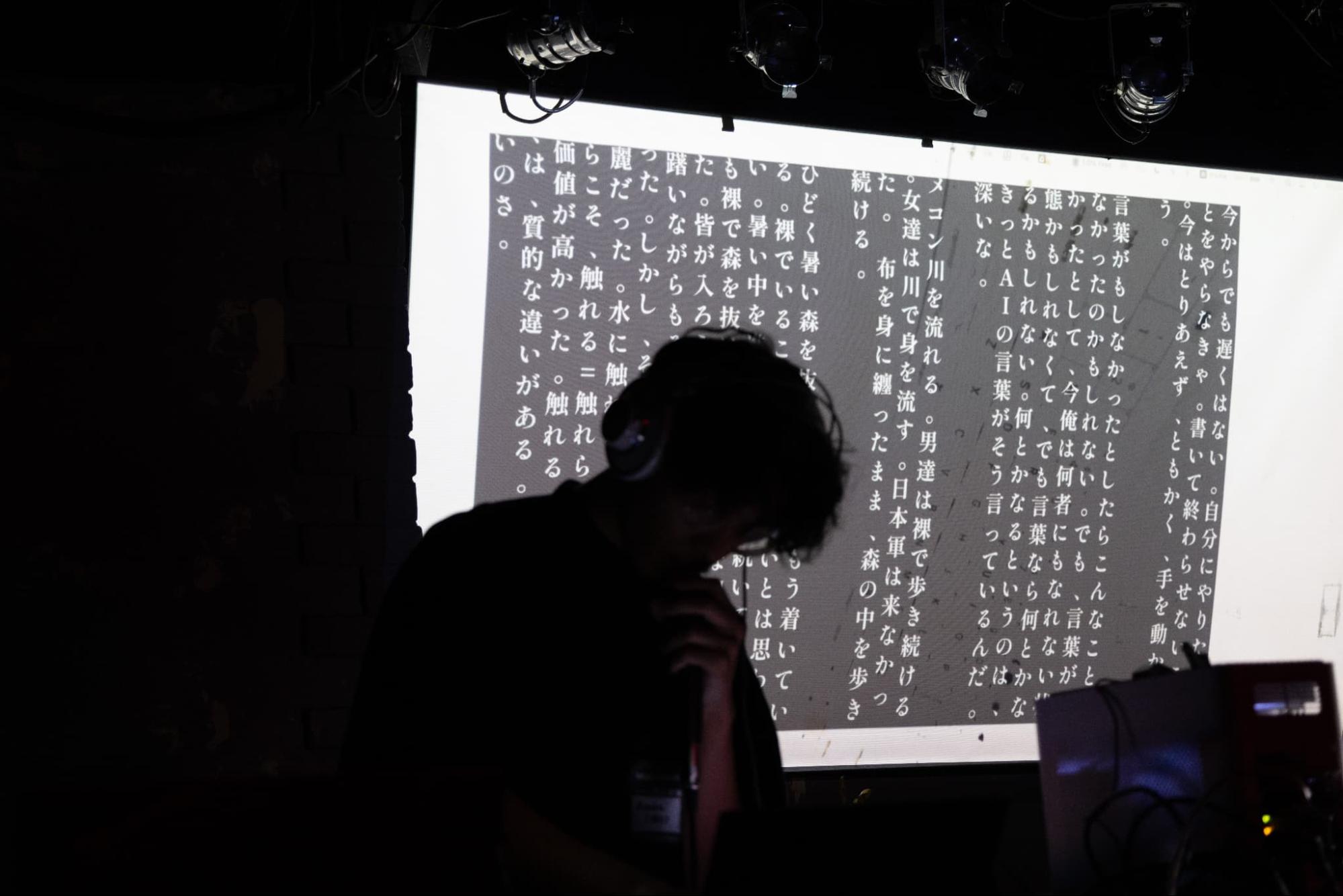作者自身の日記を学習した文章生成AIと作者である石井自身が、1行ずつ「今日の日記」を書き、声に出して詠むパフォーマンス。石井は日記を声に出して詠む一方、AIは生成中に発せられるGPUの電磁波を増幅させてノイズ音に変換し、計算機の声として鳴らす。日記の執筆を通じて、人とAIが「ふたりで一人」になる実験を行った。