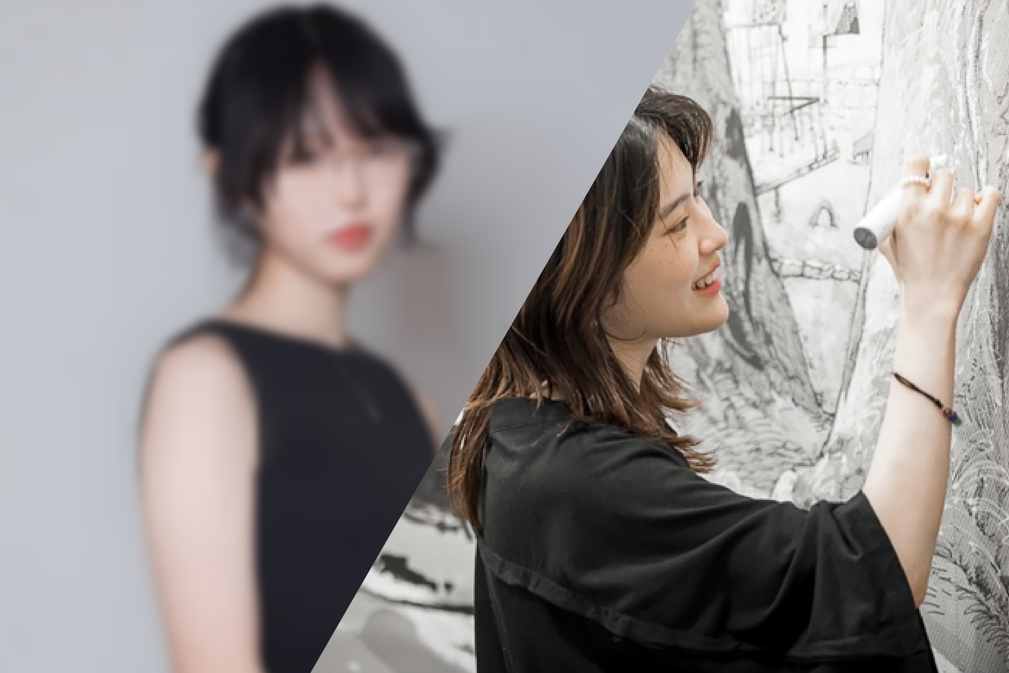 Liisa:京都精華大学マンガ学部を経て現在、東京藝術大学大学院美術研究科在籍するLiisaです。ハンガリー生まれ(中国国籍)ですが2001年にイタリアに移住、2018年に来日しました。マンガにおいて副次的な役割とされてきた背景を、絵画における「新たな風景」として捉え直して、その中で「『記号』が奪われた後に残るものはどのように成立するのか?」を探ってきました。作品に用いるのは、カッティングシートの切り貼り———いわゆる漫画のスクリーントーンを自作したものですが、最近は、絵の具を代わりに用いることができないかを模索しています。