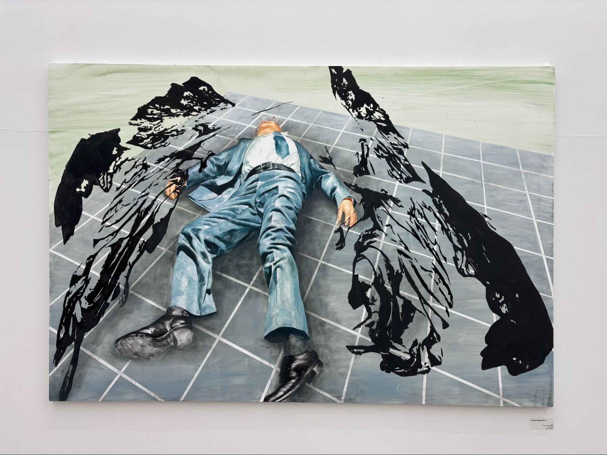 本作は大型キャンバスを用い、現代社会を象徴する背広姿の男性「AKIO」と、西洋美術史上において古典的かつ宗教的なモチーフを大胆な構図で配置することによって、その意味を現代的に再解釈することを試みた。