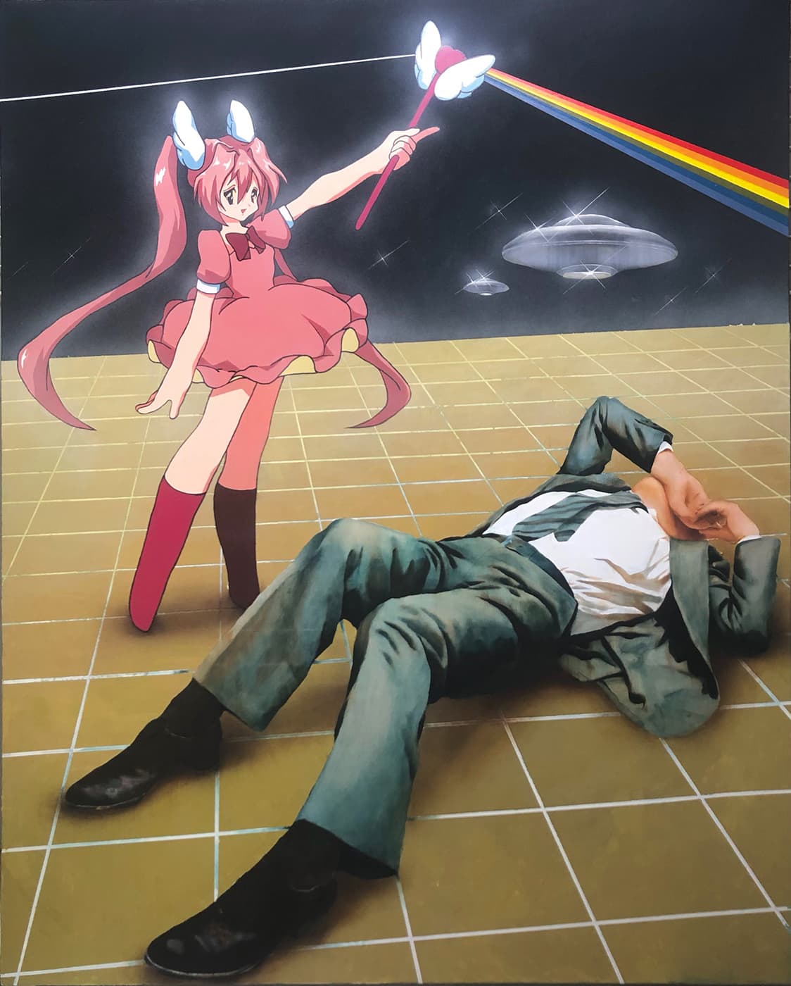 市川:市川慧です。東京藝術大学油画専攻に在学しており、画面の中に西洋絵画の奥行きのある写実的技法と日本の絵画表現における「スーパーフラット」な表現を共存させた、主にペインティングによる独自技法など研究、試作中です。独自の精神世界の概念を投影したモチーフ———混沌とした現代社会の中に存在するどこか欠落したものを抱えて生きる人々の象徴のような背広姿のAKIOと二次元で描く魔法少女など———による、次元の違うもの同士がクロスオーバーする特異点を舞台に配置し、現実と虚構が入り混じる世界観を、キャンバスという舞台の上で、映画監督のように彼らを演出するような感覚で「現代の寓意画」として表現しています。