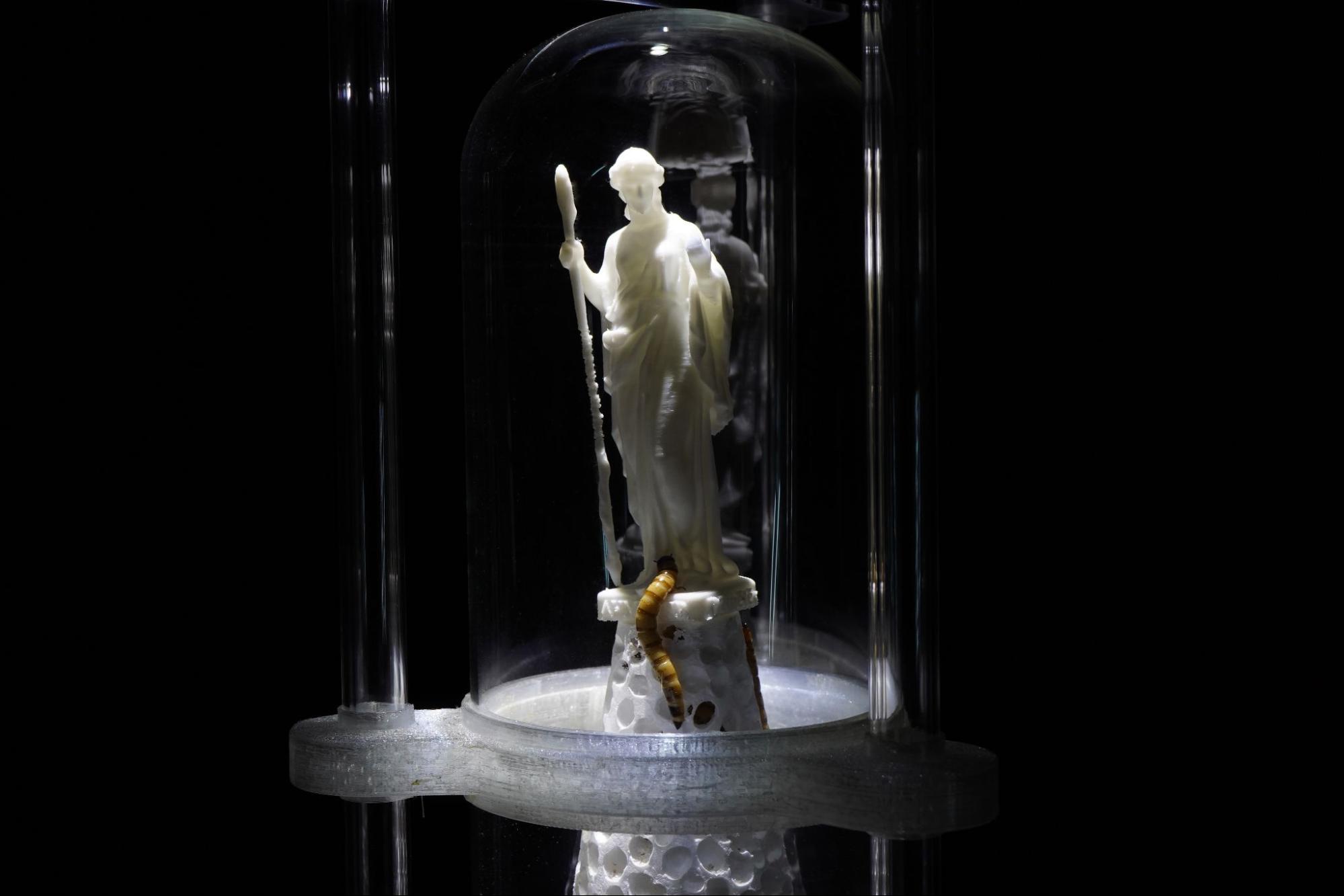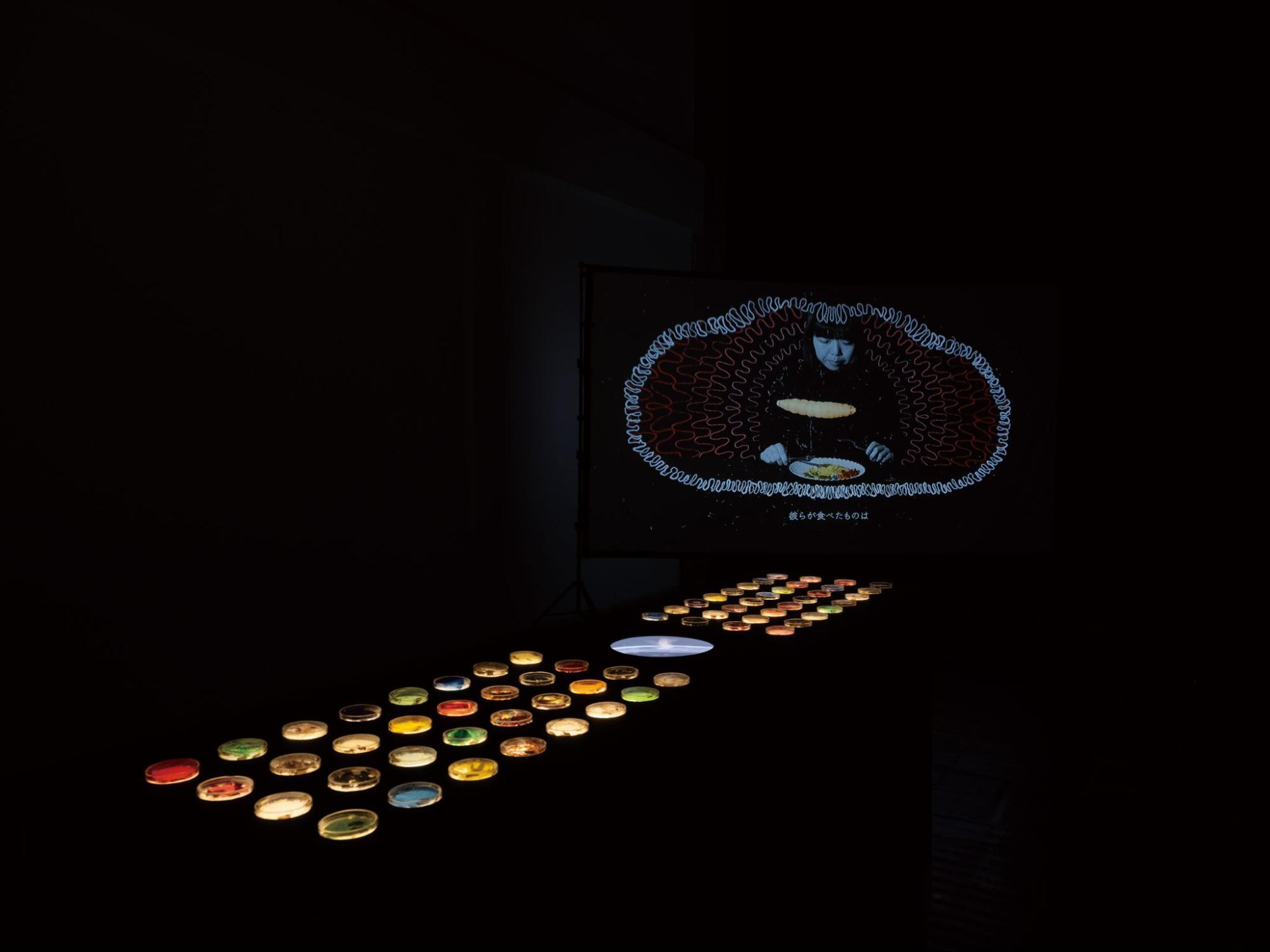 プラスチックを食べ、生分解するワックスワームをシャーレの中で培養し、人工物を内包した自然のサイクルを擬似的に作り出す「文明を食べる精霊」として捉え、制作した作品。これを中巛自らの体内に招き入れることで、身体・自然・文明の在り方を考える。