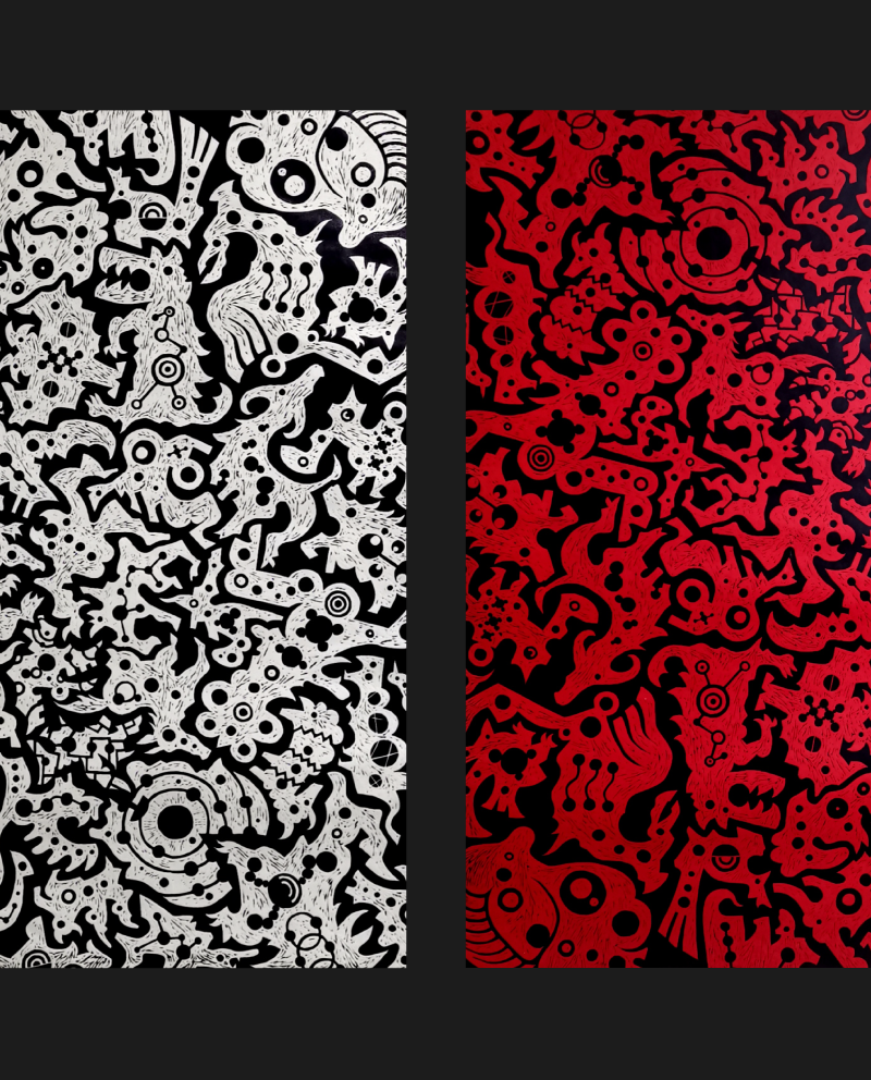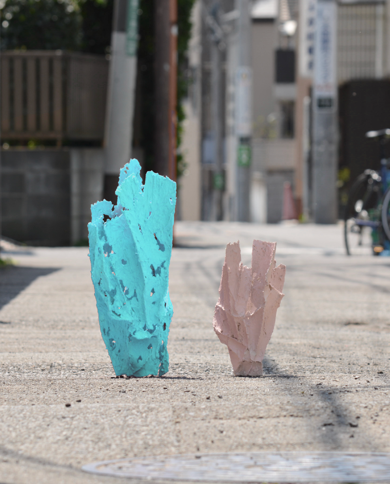 本作品の発端としては学部生時代、動物が印刷された写真に遊び心で三角定規や分度器の写真をコラージュし、その動物と製図用文房具が混じりあったかたちの輪郭をなぞることで有機的な存在と無機的な存在が交錯した中間のフォルムが生まれたのがきっかけである。主に半生物・半幾何学的なフォルムが扱われているこの作品はスロバキアへの留学中、鳥観図によって幾何学的な建築物の集合によって町が成り立っていた発見から制作した。