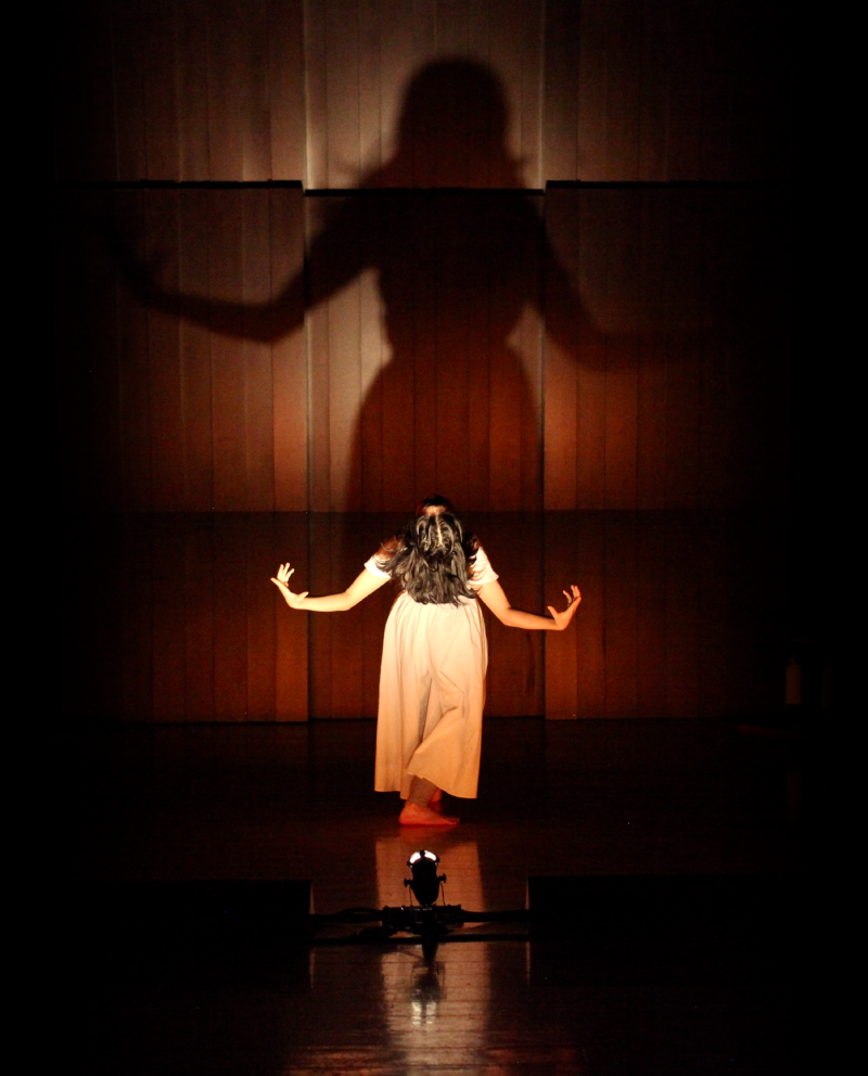 本作は能『卒都婆小町』を近代戯曲へ翻案した三島由紀夫作「卒塔婆小町」(『近代能楽集』より)を題材とした二台のスピーカーと演者によるモノオペラで、舞台上のスピーカーから流れる録音音声・音楽に合わせて演者が演技をすることで、人間/非人間/幽霊の境界を探るインスタレーション作品です。